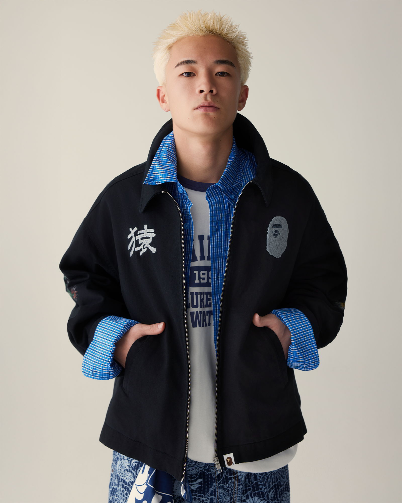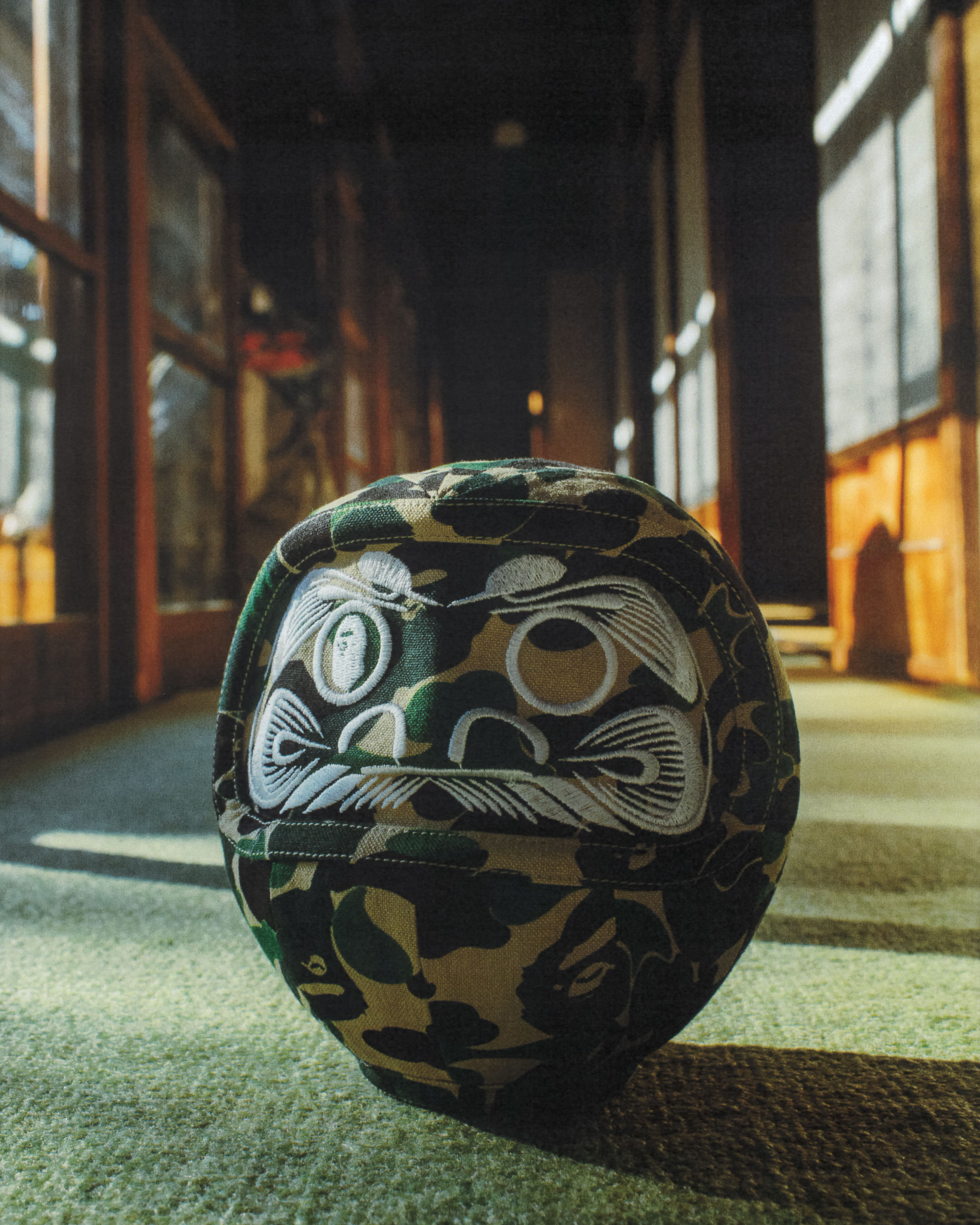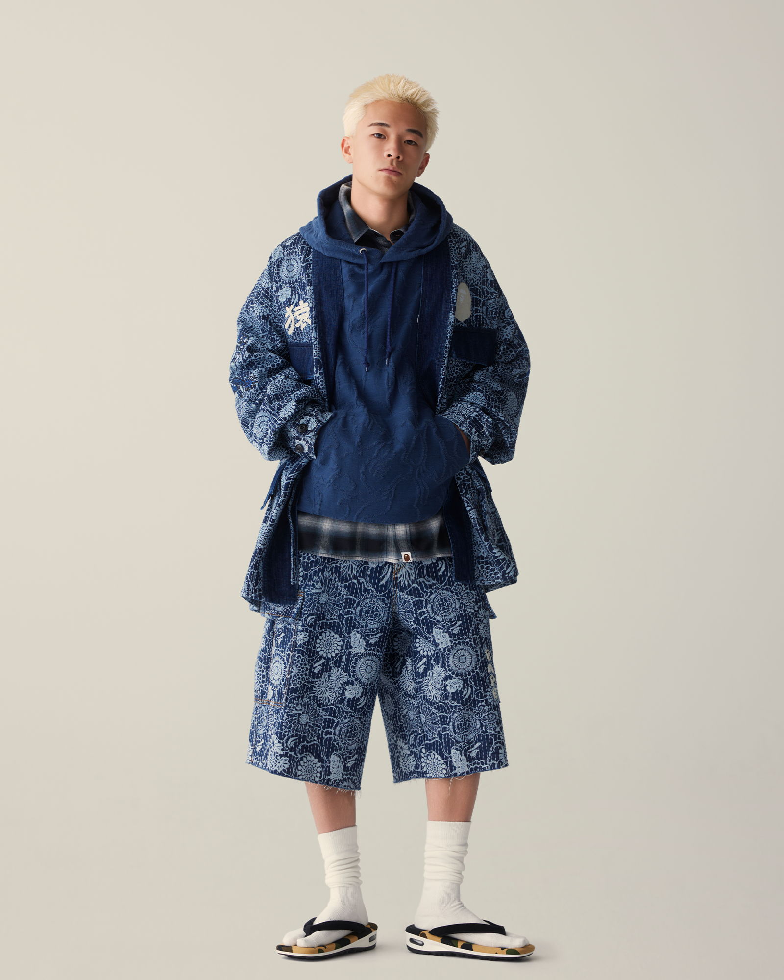 ヴィンテージの日本家屋の中で、BAPE®のSS26 ARTピースは周囲の空間と呼応するように存在しています。インディゴの色合いは時を重ねた畳の風合いを思わせ、グラフィックの大胆な表現は、無垢の木材や障子の静かな佇まいと鮮やかなコントラストを描き出します。