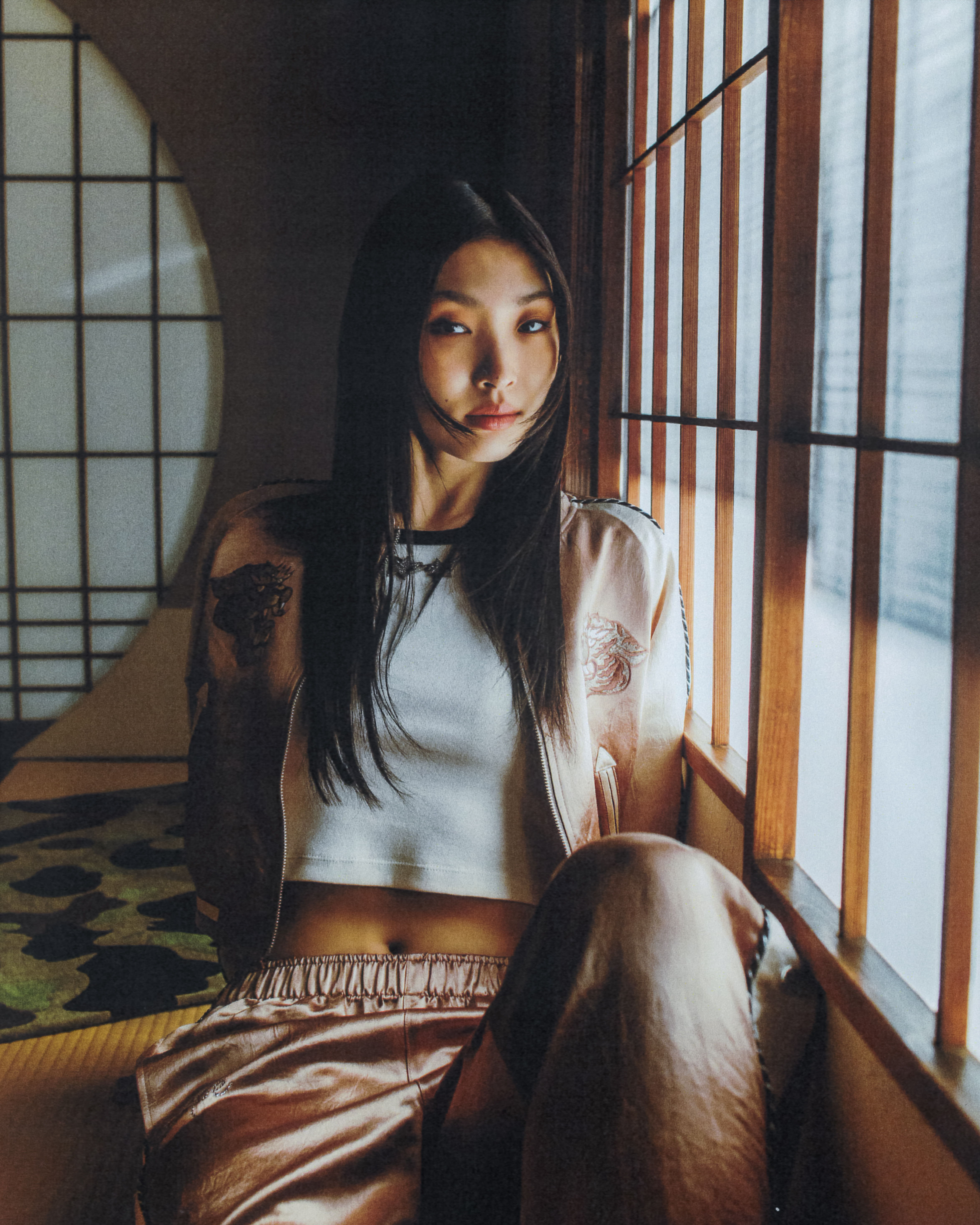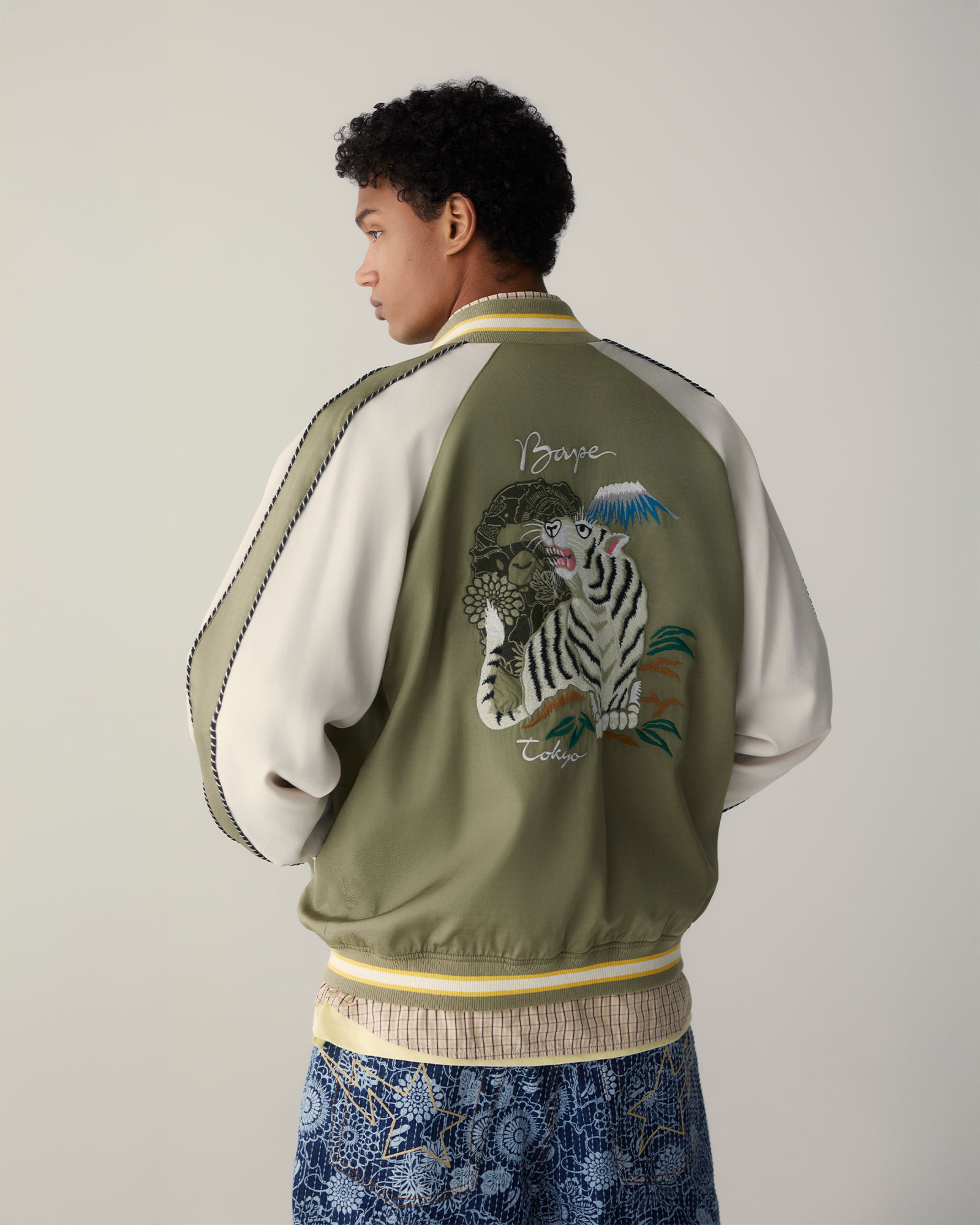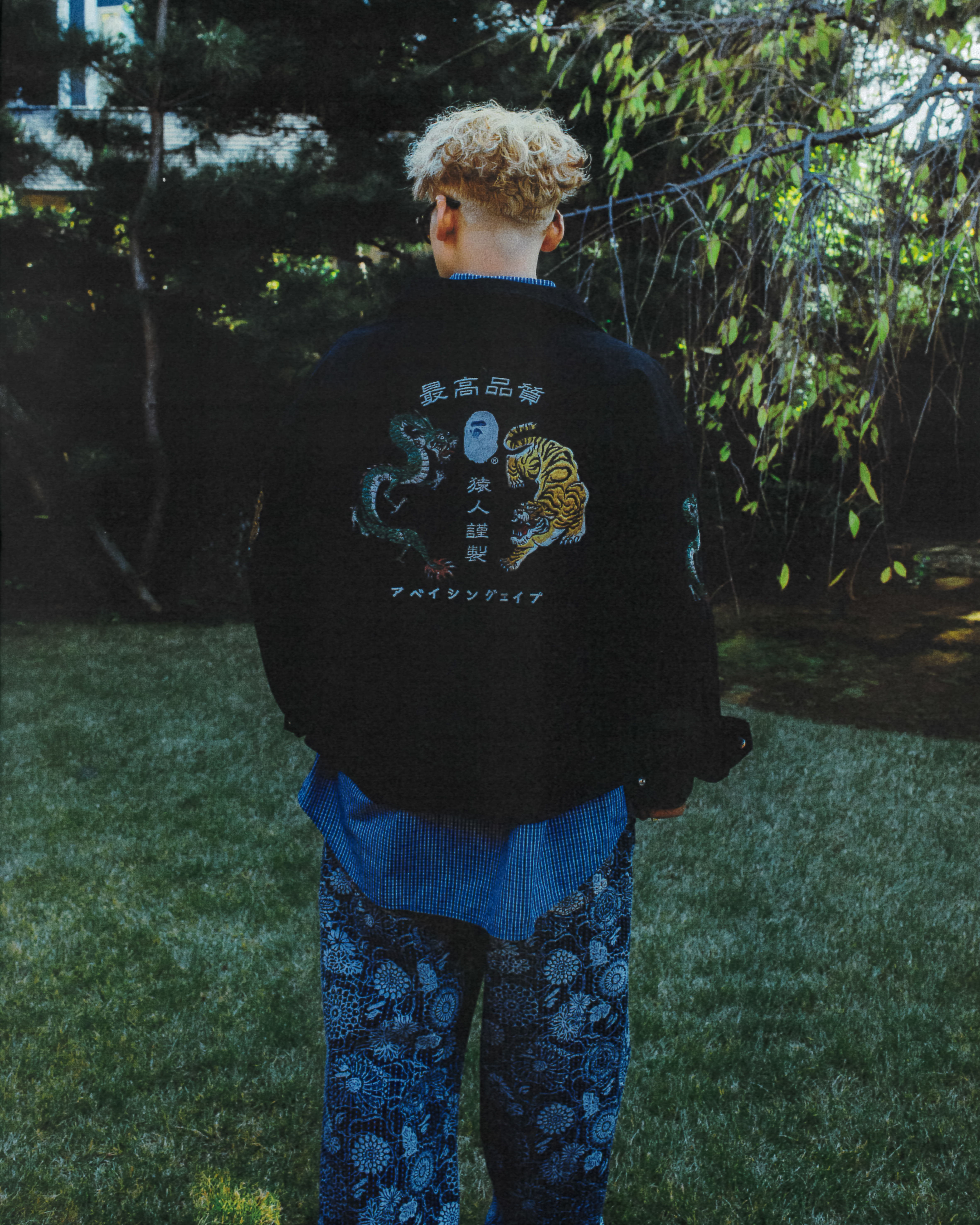 ヴィンテージの日本家屋の中で、BAPE®のSS26 ARTピースは周囲の空間と呼応するように存在しています。インディゴの色合いは時を重ねた畳の風合いを思わせ、グラフィックの大胆な表現は、無垢の木材や障子の静かな佇まいと鮮やかなコントラストを描き出します。