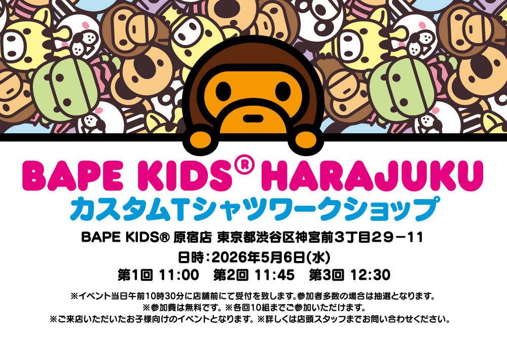 BAPE KIDS®のオリジナルカスタムTシャツを作成できるイベントを2026年5月6日(水・祝)、BAPE KIDS®︎ 原宿店にて開催します。