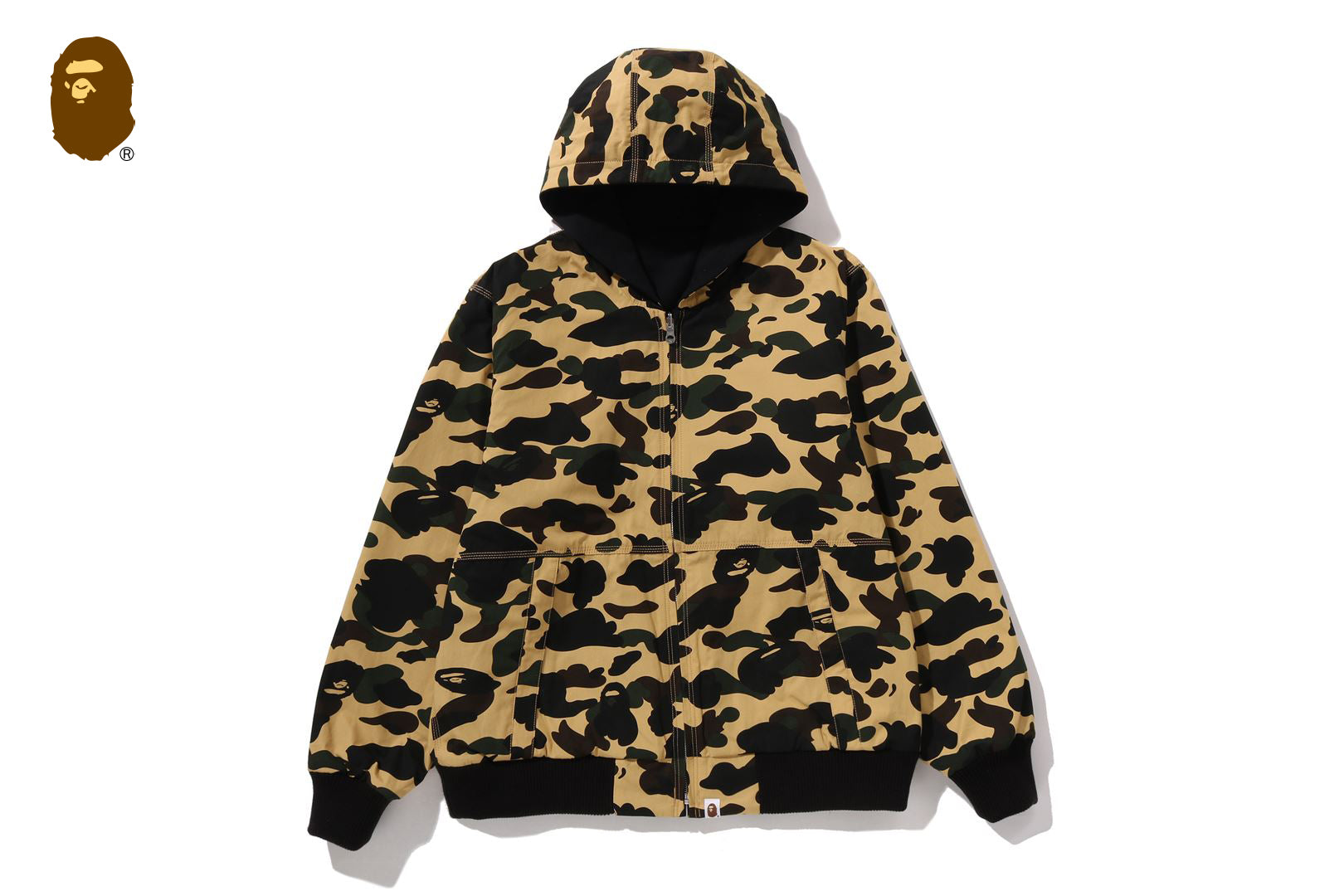 コットン素材を使用した着心地の良い、フーディージャケット。リバーシブル仕様で表側は1ST CAMO柄、裏側は無地で左胸部分にBATHING APE ロゴをプリントしたデザイン。