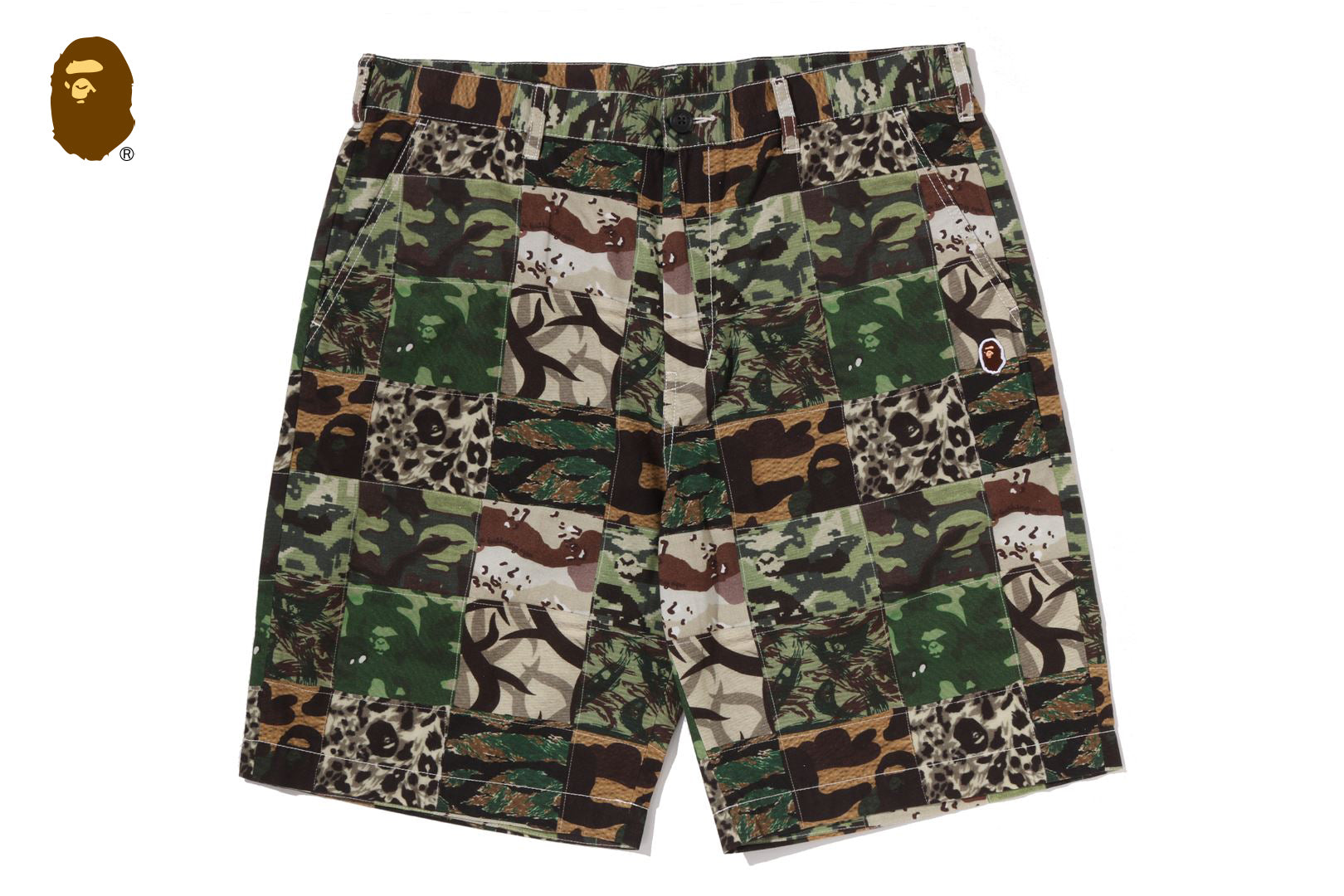 バイオウォッシュ加工を施したヴィンテージ感のあるショーツ。CAMO PATCHWORK柄を配し、左腿部分にAPE HEADのワンポイントワッペンをあしらったデザインシンプルなトップスと合わせるだけでスタイリングのアクセントになるアイテム。レギュラーフィットシルエット。APE HEAD ONE POINT CAMO PATCHWORK SS SHIRT(品番:1M30132002)とセットアップ着用可能。