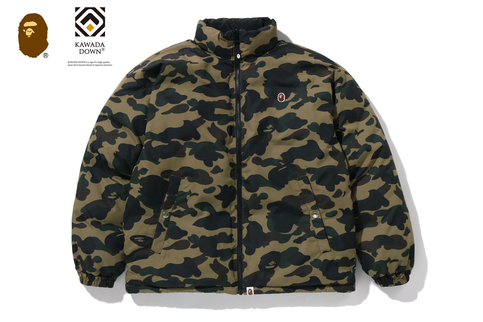 100年以上繰り返し使える「河田ダウン」を使用したダウンジャケット。リバーシブル仕様で、表面は1ST CAMO柄、左胸部分にAPE HEADのワンポイントワッペン、裏面はツートンカラーで左胸部分にはA BATHING APE ロゴをあしらったデザイン。
