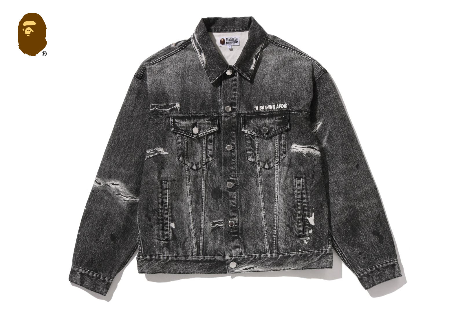 コットンを使用した着心地の良い、トラッカージャケット。A BATHING APE ロゴやダメージ加工などをフェイクプリントで表現したデザイン。BAPE STA FAKE PRINT RELAXED FIT SHORTS(品番:1M30151306)とセットアップ着用可能。