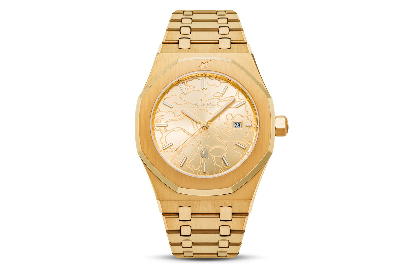 タイムレスな魅力を放つシルバーとゴールドの2色で展開します。メタルのヘアライン仕上げ、オクタゴン型ベゼル、そしてブランドを象徴するモチーフを彫刻したカモフラージュパターンなど、BAPE®ならではのデザインコードが随所に盛り込まれています。特集ページはコチラ