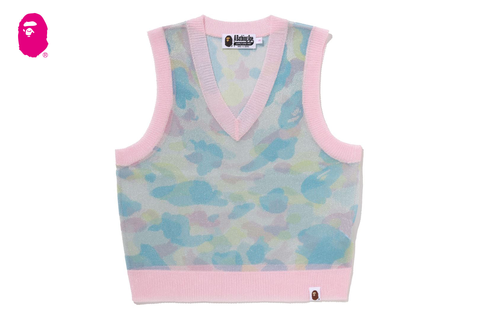 A BATHING APE®のアイコニックなアーカイブパターンである「MULTI CAMO」をベースに、現代的な感性で再構築した「NEW MULTI CAMO」コレクションが登場。特集ページはコチラ速乾性があり、お手入れのしやすいポリエステル素材を使用したニットベスト。メタリックな質感でNEW MULTI CAMO柄を配したデザイン。クロップド丈で抜け感のあるシルエットを演出。シンプルなスタイリングにアクセントを加えてくれる一着。